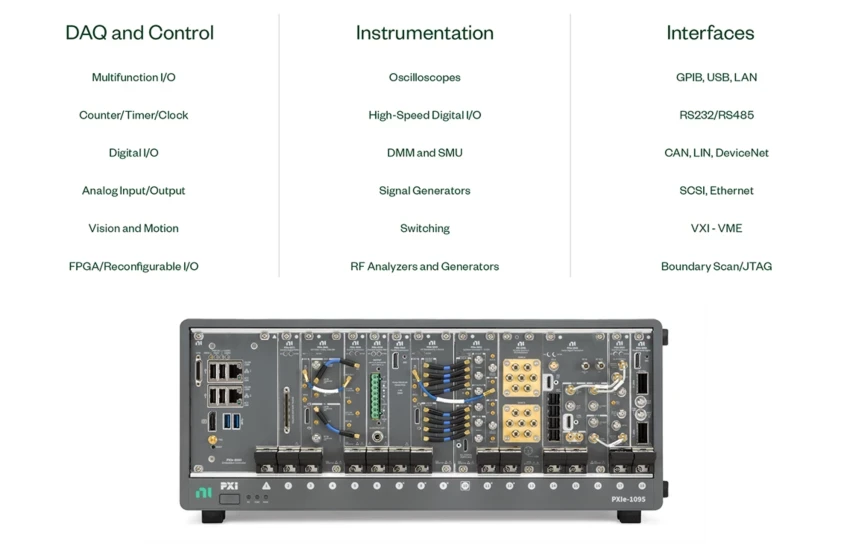 Digital Multimeter, Oscilloscope, Source Measurement Unit, DAQ, DIO & Counter 등 다양한 기능을 필요로 하는데 Stand-Alone 형태의 계측기는 시스템 통합 및 테스트 자동화를 구축하는데 적합한 구성이 아닙니다.